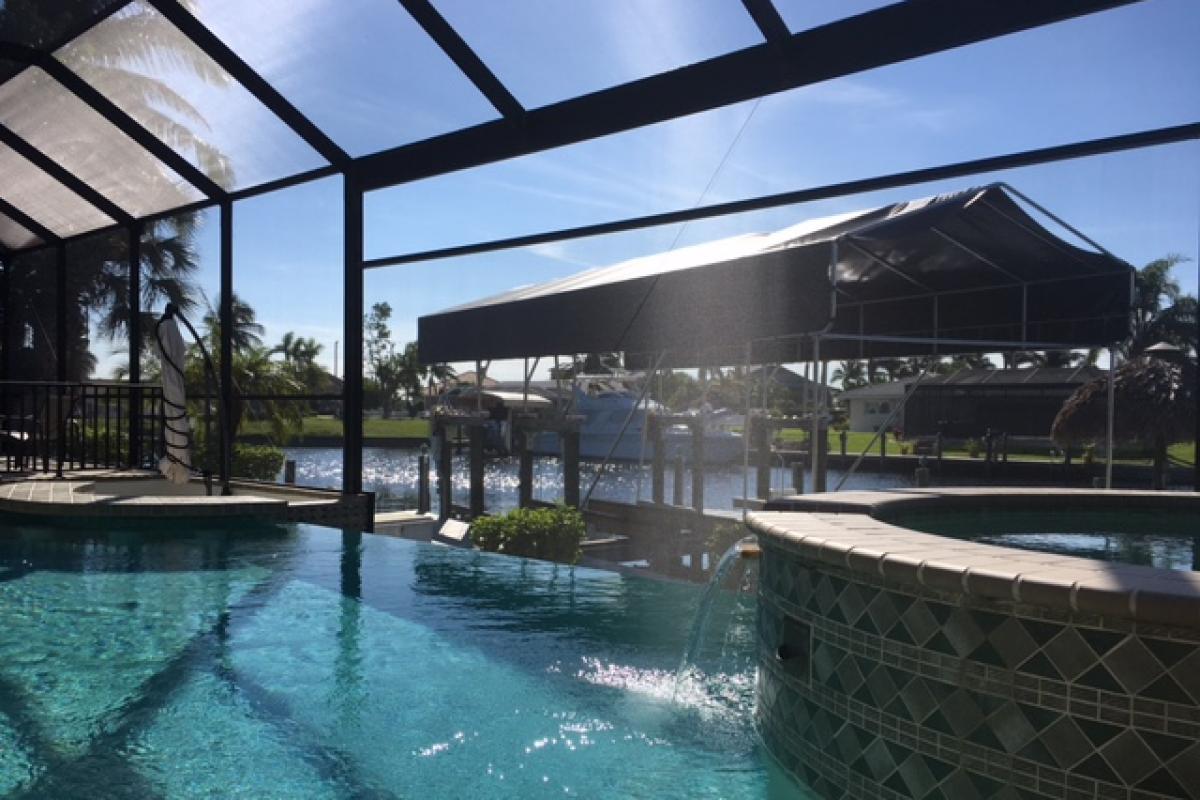 Stunning , luxurious 3 bedroom (+ office with sleeper couch), 3 bath pool home on extra wide canal with only minutes to the River and Golf. Relax in the spacious lanai with your own swim-up bar and Pavillion with fire place. Pool can be heated by electric. 2 Kayaks, NBA-Basketball Hoop with Basketball and Waterball for pool enjoyment.